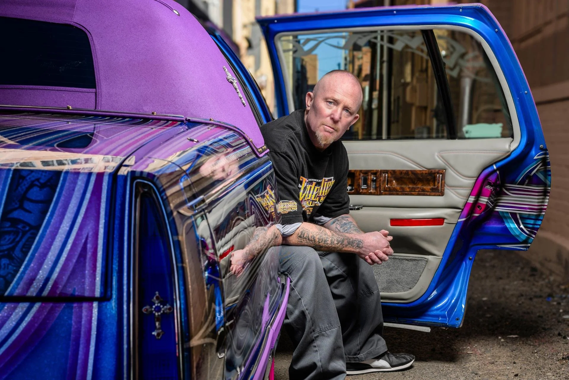 WORKING IN A STYLE HE CALLS “TASTEFUL OVERKILL,” Albuquerque native Rob Vanderslice has been painting lowrider cars in New Mexico for nearly 40 years. Vanderslice, who opened his first shop at 18 years old, uses masking tape, translucent candy paint, and metallic flakes to cover cars with brilliant color, often accented with iridescent sparkle that shifts hypnotically across intricate underlaid designs. But he is the first to admit that custom car painting has changed dramatically in the past few decades. “In the beginning, my customers were almost all drug dealers,” he says matter-of-factly. “The culture around lowriders used to revolve around drugs and violence.” During what he calls the “gangster madness” of the car scene, Vanderslice became addicted to methamphetamine. He has been sober for more than a decade. Similarly, lowrider art and the people who love it have changed significantly since those darker days. “There have been exhibits in museums like the Harwood, in Taos, which is pretty exciting,” says Vanderslice, who now teaches others the tricks of the lowrider art trade.